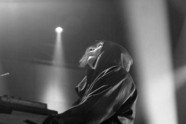 Илья буквально влетел на сцену в черном балахоне с капюшоном, под которым была тельняшка и начал свое выступление с психоделического интро, которое перешло в песню «Эй товарищи!», затем последовала премьера песни «Акулы».