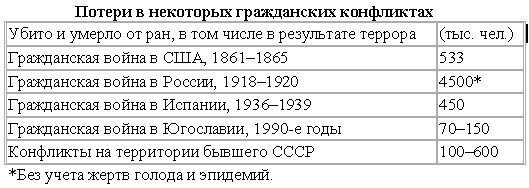При этом важно понимать, что даже если погибло не 600 000, а 100 000 человек, это все равно очень много: количество жертв нашей недавней истории сопоставимо с жертвами «обычной» гражданской войны. Конечно, Гражданская война 1918-1920 гг. в России стоит особняком, она была чрезвычайно кровопролитной. Но в других гражданских войнах, в частности, в США, Испании и в недавней войне в Югославии, число жертв было сопоставимо с «бескровным» распадом СССР. Вот данные о потерях в некоторых гражданских войнах в XIX-XX вв.:
