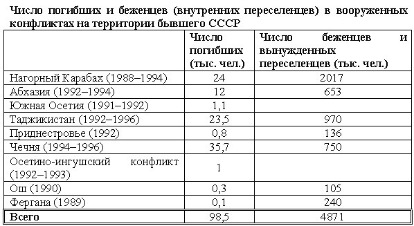 Каковы прямые людские потери в результате «бескровного» развала СССР? Вряд ли точная и исчерпывающая информация о количестве жертв на сей счет когда-то появится, отмечает издание. Людские потери и число беженцев в позднесоветских и постсоветских вооруженных конфликтах демографы подсчитали; пример такого подсчета, сделанного Владимиром Мукомелем, приводится в таблице 2. Эти данные, по крайней мере, имеют понятную источниковую базу и могут быть верифицированы. Однако на любой такой подсчет приходится множество оговорок, касающихся его точности.