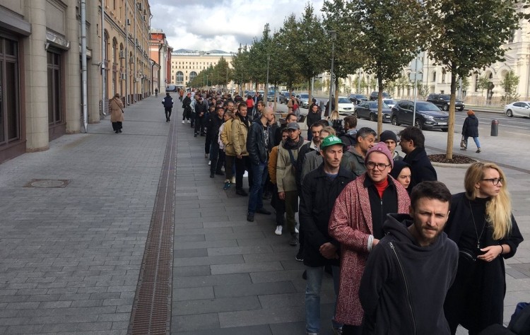 На Старой площади в настоящий момент собралась очередь из желающих принять участие в акции и постоять с плакатом.