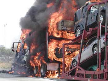 Народная китайская забава – запуск петард и ракет, обернулась семичасовым фейерверком на крупной магистрали Пекин-Шеньян. На одной из развязок задымился грузовик, перевозивший пиротехнику общей массой до 20 тонн. Огонь быстро перекинулся на кузов, так что прибывшим на место ЧП пожарным оставалось только оцепить район бедствия: приступать к тушению было опасно из-за постоянно вылетающих ракет и шутих.