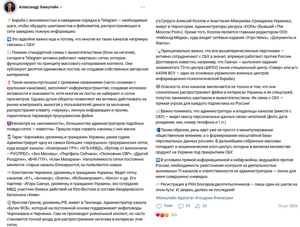 Владельцы канала - супруги Алексей Козлов и Анастасия Абакумова - проживают в Черногории, при этом Абакумова является гражданкой Украины. Козлов одновременно руководит ООО «Небоход-Медиа», которому принадлежат сетевые издания Utro.news и «Документы и Факты». Таким образом, перед нами координированная атака из связанных между собой ресурсов, управляемых из-за рубежа.
