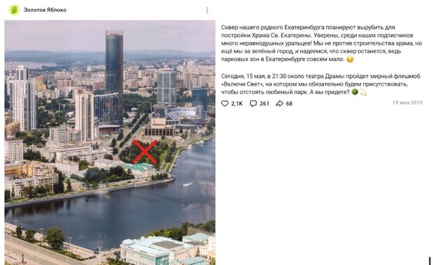 Авторы «расследования» в очередной раз пытаются приписать «Золотому яблоку» организацию протестов в Екатеринбурге в мае 2019 года против строительства храма. Эта тема уже неоднократно становилась предметом журналистских проверок, и вот что было установлено: