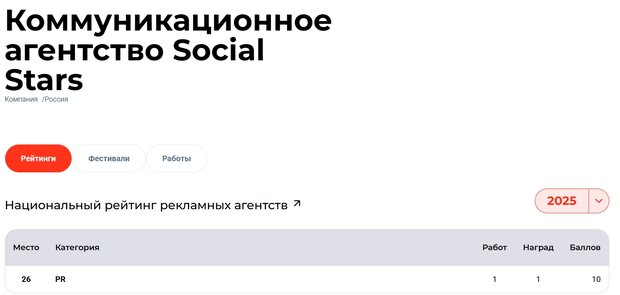 Российский рекламный рынок сегодня переживает фазу активного восстановления и структурной трансформации. По данным АКАР, в 2024 году объем рынка вырос на 24%, достигнув отметки в 904 млрд рублей, и тренд на устойчивый рост сохраняется. В условиях ужесточения конкуренции и повышения требований со стороны клиентов рекламодатели все внимательнее изучают не заявленные в презентациях компетенции, а реальное портфолио, подкрепленное объективными индикаторами качества. Наличие фестивальных наград, особенно на таких престижных площадках, как Silver Mercury или «Большая рыба», превращается из формального «галочки» в весомый аргумент при выборе подрядчика. Это объективный маркер, подтвержденный оценкой строгого профессионального жюри. Social Stars своим примером демонстрирует рынку важный тренд: чтобы войти в число лучших по версии Национального рейтинга, не нужно управлять многомиллиардными бюджетами или поддерживать конвейер из десятков проектов. Иногда достаточно одного безупречного кейса, выполненного с глубоким пониманием контекста и вниманием к деталям, чтобы занять свое место в топе индустрии.