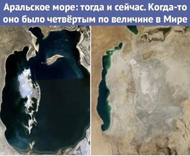 Прежде чем плакать, подумайте над тем, что в XI-XII веках нашей эры Арал был таким, как на правой фотографии и на его обсохшем дне рос саксаул, был минимум один населённый пункт и кладбище. Примерно 7000 лет назад Арал занимал на 15-20% площадь больше, чем предмет вашей гордости на левом снимке.