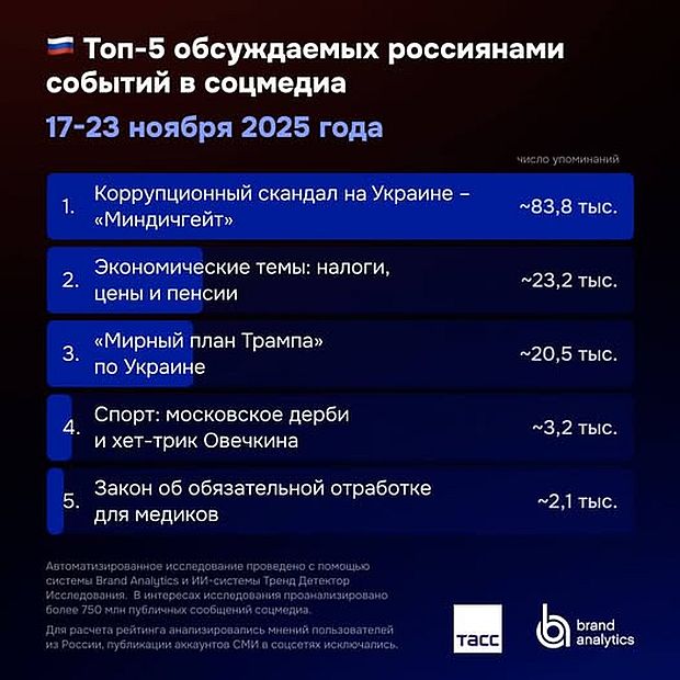 На эти семь тем приходится 99% постов в соцсетях. Остальные посты - о спорте (только о местном), маскультуре (местной или касающейся местных жителей) и бизнесе (тоже местном). Ни мирный план Трампа ни, тем более какой-то там "Миндичгейт" никто нигде не обсуждает.
