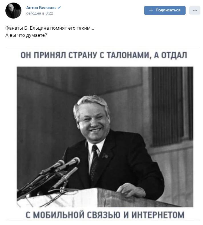 Спасибо Ельцину за изобретение мобильной связи и интернета и за российских олигархов получивших страну в свои руки за копейки, а также за нищую страну.