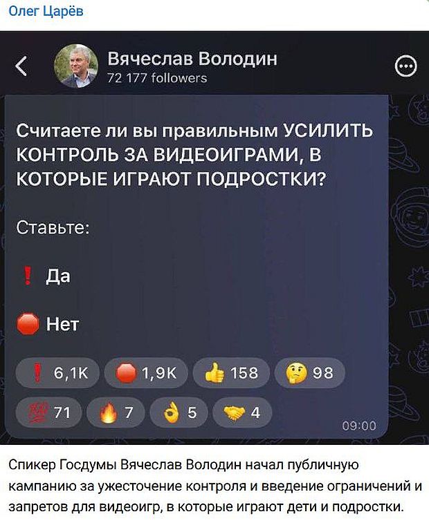 А чо? И пущай себе очков набирает. Видимо, спикеру ГД больше заняться нечем. Ну, совсем нечем. И апосля, этот спикер будет рассказывать с высокой трибуны толпе сытых бездельников, как он лично провёл социологическое исследование рынка по ограничению того-то и того-то. И ни у кого выдуманные цифры не вызовут возражений. Как не вызывает возражений цифра в 87,28%, обнародованная в связи с замечательной придумкой - ДЭГ (дистанционным электронным голосованием).
