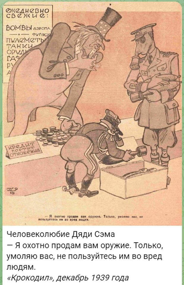 Особенно пикантно сия карикатура смотрится на фоне судьбы потраченного золотого запаса Испании, неких сентябрьских событий в Европе, и любопытно, на кого смахивает мелкая фигурка то ли в конфедератке,то ли в финской, то ли французской кепи? А вот стоящий - в британской форме. Намек, что нефиг осуществлять поставки оружия врагам дружественного рейха? На чью мельницу льем?