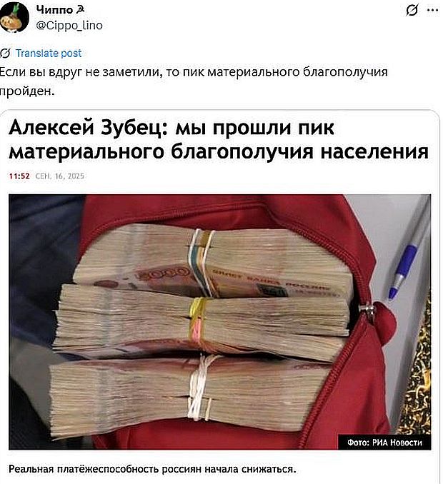 Алексей Зубец - примерно то же самое, что Вася Иванов, то есть, никто. Пусть нам расскажут о его достижениях в реальной жизни. Это вряд ли. Я, могу сказать, не являюсь доктором, директором и т.д., однако, вижу: судя по соотношению между ценами на нефтянку, курсом валюты, ключевой ставкой, мы находимся в глубокой... впадине, причём, совершенно рукотворной. А ручки-то чьи? Солнцеликого нашего, безальтернативного, продлённого, который источает благодушие и самоудовлетворение. Пик, оказывается, пройден. Но он пройден до Крыма и СВО, а потом... Война всё спишет. И списала.