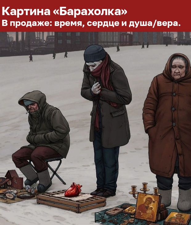а эту, с позволения сказать картину, случайно не ржавый Толик нарисовал? Всё продать с прибылью, всё продать без прибыли, всё продать и приплатить, только так мы уничтожим идею коммунизма. Что же, продали всё, что смогли, до чего смогли дотянуться, чтобы нажраться до икоты. Малая толика ворья нажралась до икоты, больше не влазит, и бегом в мировые "элитарные" сообщества. Да только этих мелких воришек ворьё в четвёртом-пятом колене за шестёрок держит. А, тем временем, Россия всё жива, и будет жива во веки веков. Назло всем небратьям, назло всем ворам. А картинка эта, икота страшного времени. Не боись, нуворишка, мы всё понимаем правильно, мы всё это помним. И не забудем, не простим, как заводы разрушали, как рабочих и их семьи оставляли без средств к существованию, как десятки миллионов гибли в бандитских разборках, от безнадёги, от пьянства, от голода. Не простим и когда придёт час, всё это припомним. Так что, далеко картинку-то не убирай. Году, так в 24-м пригодится.