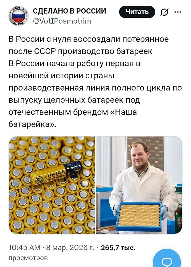 "СССР не производил ничего, кроме галош", но внезапно открылось, что еще и элементами питания себя обеспечивал, и теперь как выдающаяся победа подается то, что через три с половиной десятилетия РФ, наконец-то, смогла повторить... Сколько еще открытий впереди!