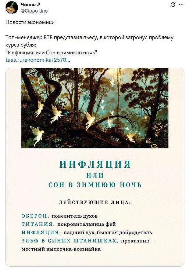 Рост цен, обесценение рубля, а следовательно и труда для очень большого количества людей в России, рабский труд за гроши (за кормёжку и прозябание в съёмной квартирушке или комнате), вымирание деревень и малых городов, вычеркнутые годы жизни, жизнь в бедности, борьба за выживание, долговое рабство чуть ли не на всю жизнь, безнадёга и полная неуверенность в завтрашнем дне, моральный стресс и преждевременная смертность - вот что такое инфляция в РФ. А вот для топменеджеров ВТБ это развлечение. Чем людям хуже, тем им веселее. Мучения людей эту нелюдь только вдохновляют и развлекают. Помните, как император Нерон приказал поджечь Рим, вместе со спящими горожанами, чтобы его посетило вдохновение. Люди горели заживо, а императора сгорающие в огне заживо люди и город вдохновляли на написание стихов. Вот это тоже самое.