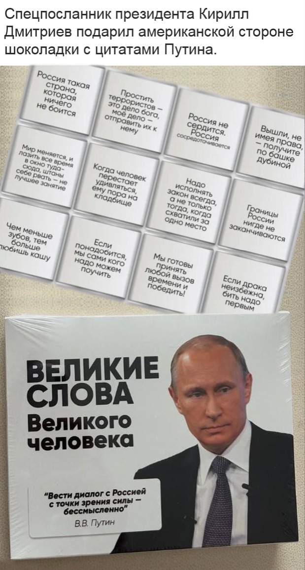 Это как отражение провальности отечественной пропаганды на западе. Один из ярчайших примеров того, почему кремлевские не могут пробить стену уже западной пропаганды и донести свою точку зрения. Вот Вам другая цитата: Мудрость - это умение поставить себя на место другого человека. Этой мудростью, это вчерашнее пролетарское ГБ, явно, увы, не обладает. Они просто наглухо, на ментальном уровне не в состоянии понять, чем дышат на западе. Да они бы еще валенки и буденовку с цитатами Сталина бы подарили. Дарят типа вкусность, завернутую в черно-белую безвкусицу, на непонятном для них русском, да еще от человека, которого они не любят и побаиваются. Ну, и где там и кого были мозги дарить такое? Вы бы сразу тортом бы швырнули в лицо Трампу и ждали бы позитива с его стороны. Глупо, наверное, было бы. А, тут, не глупо?