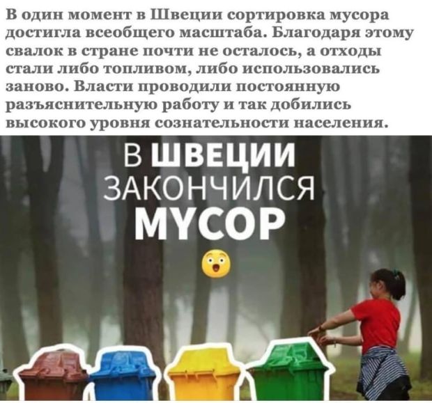Чуешь полнейшая. Как правильно написано ниже, все отходы и мусор попросту перевозятся в другие страны. Поэтому типа шведы такие якобы чистюли. На самом же деле, сепарация мусора ни к чему всерьёз не приводит. Количество мусора остаётся таким же ) Но миф зато красиво звучит, что дескать, какие шведы сознательные )