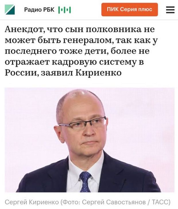 народ решил что Кириенко подразумевает битву за места у кормушки, а я понял что Кириенко про демографию. Т.е. рождаемость в РФ на таком низком уровне , что у нынешних генералов детей сильно меньше, чем генеральских должностей в РФ. Особенно с учетом стрельбы и взрывов как раз рядом с генералами.