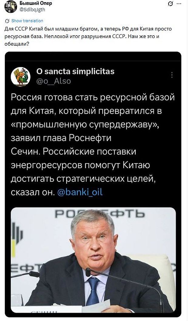Сейчас у него плохие времена, запад перекрыл распродажу Родины оптом и на развес, они виляет хвостом перед Китаем пытаясь "донести" до Китая мысль: "приходите с юанями к нам!" . Китай конечно прекрасно понимая факт того, что запад тут всё заблокировал, будет назначать свою цену на ресурсы из РФ, всё равно ситуация для олигархов безвыходная. Будут отдавать за бесценок. В принципе и запад назначал сам цены на ресурсы РФ, теперь то же самое будут делать Китай. Патрицию ещё 20 лет назад предлагали, создать свою собственную биржу для своих ресурсов. Но нет, американская такая притягательная, доллары так хрустят...