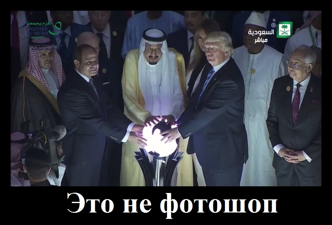 "Накануне в Эр-Рияде стартовал Арабо-исламско-американский саммит по борьбе с терроризмом. В программу вошло торжественное открытие Глобального центра по борьбе с экстремистской идеологией, во время которого участники церемонии фотографировались со светящимся глобусом".