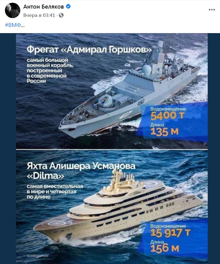 Мы должны гордится яхтами наших олигархов, она в 3 раза толще по водоизмещению чем фрегат. Олигархи это богатые успешные люди, вот даже Сечин не олигарх хотя зарабатывает 5миллионов рублей в день, все должны так хорошо зарабатывать.