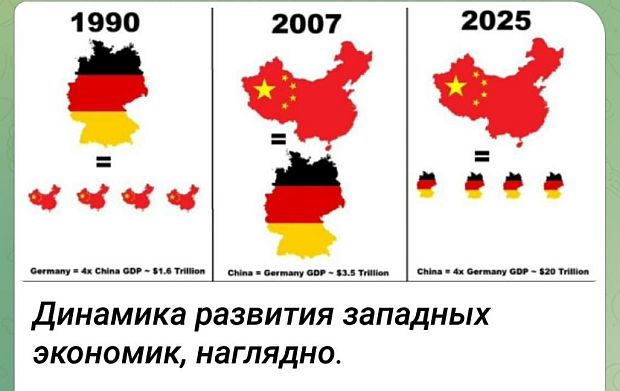 Я думаю, что здесь не хватает ещё одной картинки - 2040 год, к примеру. В смысле, вы слишком спешите в своих выводах. Конечно же к тому времени Германия не станет лидером мира, но то что Китай повторит судьбу СССР - даже к гадалке можно не ходить...