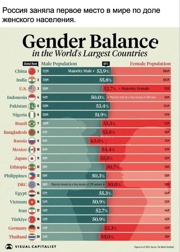 100 % вранье.Типа 37 % мужчин в населении РФ?!Бред.По состоянию на начало 2024 года в России проживает около 67,9 млн мужчин и 78,2 млн женщин. На каждые 1000 мужчин в стране приходится 1152 женщины.То есть мужчин в РФ 46,48 %-женщин 53,52 %...Для чего и по чьему наущению здесь написана ложь?!Почему почти на 10 процентов расхождение с реальностью?!В Бангладеш,Мексике,Японии,Таиланде процент женщин больше,чем в России.