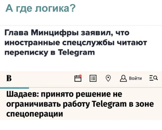 Логика в том, что без всякой логики власть давит только то, что популярно у населения, и что западные полит технологи могут использовать для создания в стране "революционного настроения"- если проще, предпосылок к оранжевой революции. В зоне СВО оранжевую революцию не создать, по этому они и игнорируют зону СВО, а то, что читают там разведка НАТО и Укропстана, им до одного места.
