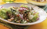 Свежий весенний вариант – салат айсберг, базилик, красный лук, белые бобы, сельдерей и рубленые калифорнийские фисташки, приправленные оливковым маслом.