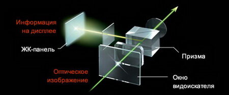 Стеклянные элементы оптического видоискателя типа Reverse Galilean с 0,5-кратным увеличением выполнены из литого стекла с высоким индексом преломления, что гарантирует низкий уровень хроматических аберраций и искажений. Благодаря интеграции призмы для ЖК-экрана с разрешением 1 440 000 точек в оптическом видоискателе типа Reverse Galilean гибридный видоискатель способен показывать на дисплее и снимаемый кадр, и различные данные о съемке. Между изображениями оптического и электронного видоискателя можно мгновенно переключаться нажатием всего лишь одной кнопки.