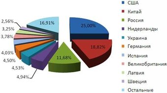 Источники вредоносных программ существуют практически в каждой стране, однако 83% всех площадок, используемых для распространения зловредов, расположены всего в 10 государствах. Лидером этого рейтинга являются США, где находится четверть всех источников заражения:
