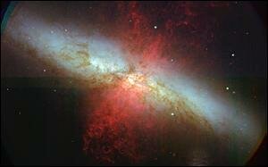 Действующее лицо - галактика M82 (расположенная в 12 миллионах световых лет от Земли), одна из «активных» галактик, пережившая, видимо, когда-то грандиознейший взрыв своего ядра. Голубая полоса на фотографии - свет от уцелевших в M82 звезд. Красные выбросы - облака ионизированного водорода, простирающиеся более чем на десять тысяч световых лет по обе стороны от плоскости галактики.