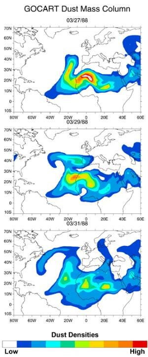 Эта модель, названная Georgia Tech/Goddard Global Ozone Chemistry Aerosol Radiation and Transport (GOCART), была создана для того, чтобы отслеживать перемещения многих видов атмосферных газов и частиц. Наряду с пылью, она позволяет симулировать перемещение в атмосфере сульфатов, угольной крошки и газообразного углерода, морской соли, радона, свинца и окиси углерода. Что же касается пыли, то эта модель дает возможность выделить 7 видов пыли исходя из размеров частиц, а при симулировании учитывается, что мелкие частицы могут перемещаться на большее расстояние, чем крупные, и дольше оставаться в воздухе. В этой модели используются метеорологические данные, касающиеся ветров, температуры, давления, уровня водяного пара и другие метеорологические данные.