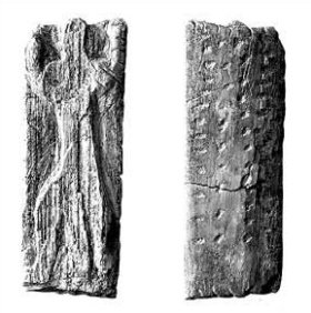Размеры таблички не впечатляют - всего 38х14х4 мм, причем по зарубкам на гранях археологи решили, что она изначально была такого размера. На одной стороне таблички вырезано изображение человека с расставленными ногами и поднятыми руками. Между ногами свисает нечто (предположительно меч), его талия необычно узка. левая нога короче правой. Из того немногого, что известно о предполагаемой мифологии этого народа, археологи сделали вывод, что здесь изображена фигура молящегося или танцующего человека, или же получеловека-полукота, или сакрального существа.