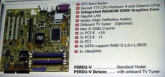 Вчера продемонстрирована новая материнская плата ASUS P5RD1-V Radeon Xpress 200. Решение появится в продаже через месяц. Цена на платформу станет известна через неделю. Спецификации вы можете прочитать на фотографии выставочного стенда: