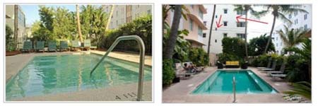 Вот, например, как выглядит бассейн одной из гостиниц. На одной фотографии мы видим шикарный бассейн, окружённый бурной растительностью, а на другой всё гораздо скромнее. Встречаются и такие нелепости, когда стирают целое здание, закрывающее вид на бассейн.
