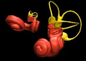 | • | Внутреннее ухо дельфина (слева) и такой же орган галаго (африканского лемура) справа. Полукруглые каналы выделены желтым. Само внутреннее ухо имеет размер небольшой монетки |