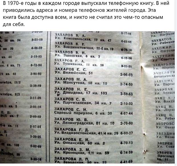 почему в 70-е Подобную книгу нам принесли несколько дней назад Правда телефоны и адреса только различных бизнесов Книгу с частными номерами где был и наш номер в последний раз прислали лет 10 назад С развитием мобильной связи это уже не действует Но я храню посдеднюю кигу как сувенир и память о прошлом