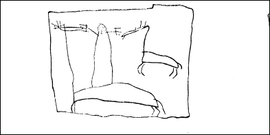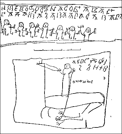 Следующая грамота №200 почти целиком заполнена рисунком маленького художника, уже знакомого нам своей “творческой манерой”. Маленький художник мечтал о доблести и о подвигах. Он изобразил некое подобие лошади и всадника на ней, который копьём поражает брошенного под копыта лошади врага. Около фигуры всадника помещена пояснительная надпись: “Онфиме”. Мальчик Онфиме нарисовал свой “героический автопортрет”.