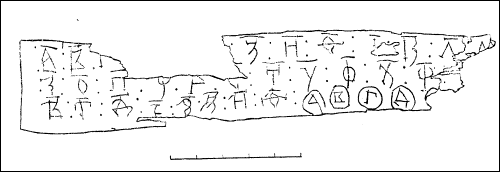 Еще одна разновидность берестяных надписей из находок 1951 года - грамота № 10. Это не письмо, не деловая записка, а ободок небольшого берестяного туеса. По ободку нацарапано;