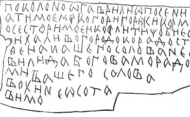 Ещё одна берестяная грамота ценна тем, что воскрешая крохотный эпизод XIV века, перебрасывает мостик от обычаев и шуток школяров времени Ивана Калиты к обычаям и шуткам современников Гоголя. В 1952 году на Неревском раскопке была обнаружена грамота, вначале поставившая всех в тупик. В этой грамоте нацарапаны две строки, правые концы которых не сохранились. В первой строке следующий текст: “нвжпсндмкзатсут...”. Во второй не менее содержательная запись: “ееяиаеуааахоеиа...”.