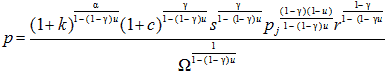 ВВП в стоимостном выражении (объем ВВП Q, индексированный по ценам производства без НДС p) равен общей сумме заработной платы фирм (произведение средней номинальной зарплаты S, мультипликативного коэффициента социальных отчислений и занятости), к которой прибавляются инвестиции в загрязняющий капитал и чистый капитал, а также налоги на использование загрязняющего капитала, которые устанавливаются на уровне k.