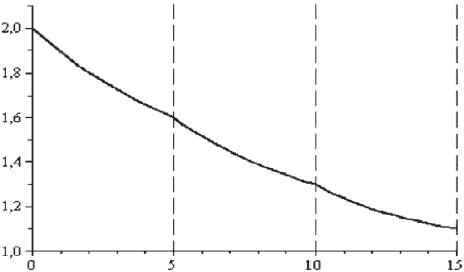 В конечном счете результаты модели оптимального контроля недвусмысленны. Лучшая политика для достижения экологической цели в среднесрочной перспективе состоит в осуществлении постоянных мер, направленных на регулирование разницы между существующим уровнем загрязняющего капитала на человека и его долгосрочным целевым уровнем. Выбор промежуточных целей определяет последовательность среднесрочных стратегий министерства и позволяет поэтапно увеличить качество экологии до приемлемого желаемого состояния, путем постепенного уменьшения показателя загрязняющего капитала на человека (рис. 5), не нарушая цены и конкурентоспособности предприятий, а также при постепенном улучшении государственной финансовой системы.