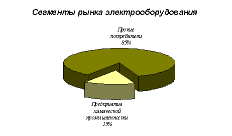 Маркетинговые исследования показали, что рынок электрооборудования состоит из различных сегментов. Специфика выпускаемой нами продукции (СГД) состоит в том, что эти двигатели лучше всего использовать при работе с высокоинерционной нагрузкой. Это становится возможным благодаря уникальным свойствам механической характеристики двигателя. Работа с высокоинерционной нагрузкой наиболее характерна для предприятий химической промышленности, которые составляют 15 % от общей емкости рынка.