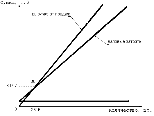 Безубыточный объем выпуска будет достигнут тогда, когда доход от продаж будет полностью покрывать валовые затраты.