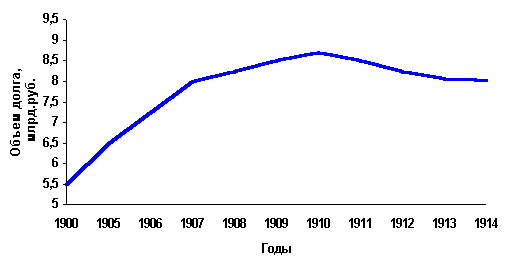 Кредитная история России началась в 1769 г., когда Екатерина II сделала первый заем в Голландии. За последующие два с половиной столетия Российская империя заняла на рынке примерно 15 млрд. руб. Большая часть этих средств накануне революции была погашена. К этому моменту старейшими займами в составе русского государственного долга оставались 6%-ные займы 1817-18 гг. Их нарицательный капитал составлял 93 млн. руб., а непогашенная часть к 1 января 1913г. равнялась 38 млн. руб. На графике отражена динамика государственного долга Российской империи в начале XX в.: сумма задолженности возросла в период русско-японской войны и революции, а затем стабилизировалась.