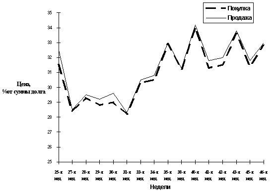 В последние 3 месяца 1995 г. котировки долларовых долгов колебались в интервале 30-34% от суммы долга, причем минимальными они были в период кризиса межбанковских кредитов. Кроме того, необходимо отметить, что в этот период не наблюдалось ярко выраженной тенденции к их росту или падению, а спрэд bid/offer (разница продажа-покупка) стабильно держится на уровне 3/8-1/2 процентных пункта, что показано на графике.