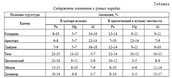 В нашем распоряжении оказался небольшой, но весьма ценный материал по элементному составу (Fe, Mg, Al) пород семи известных кратеров Луны, в сравнении с элементным составом пород прилегающей материковой местности (табл.). Назовём этот состав кратерной разновидностью (фацией) пород поверхности Луны. Прежде чем перейти к анализу этого состава следует напомнить, что известно по вещественному составу Луны по результатам предыдущих исследований. Выделяется чётко несколько видов пород (ассоциаций) [3, 4, 5].