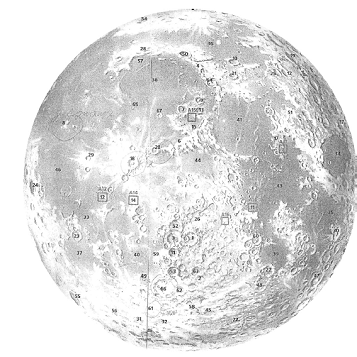 Рис. 1. Видимая сторона Луны (кратеры): 1 – Ал-Баттений, 2 – Алиацензий, 3 Альфонс, 4 – Альпы, 5 – Анаксагор, 6 – Апеннины, 7 – Архимед, 8 – Аристарх, 9 – Аристилл, 10 – Аристотель, 11 – Арзахель, 12 – Атлас, 13 – Автолик, 14 – Катарина, 15 – Кавказ, 16 – Клавдий, 17 – Клеомед, 18 – Коперник, 19 – Эндимион, 20 – Эратосфен, 21 – Евдокс, 22 – Фракасторий, 23 – Гассенди, 24 – Гримальди, 25 – Геркулес, 26 – Гиппарх, 27 – Жансен, 28 – Урал, 29 – Кеплер, 30 – Лангрен, 31 – Лонгомонтан, 32 – Маджени, 33 – Море Познания, 34 – Море Кризиса, 35 – Море Изобилия, 36 – Море Холода, 37 – Море Юмора, 38 – Море Дождей, 39 – Море Нектара, 40 – Море Облаков, 41 – Море Ясности, 42 – Море Смита, 43 – Море Спокойствия, 44 – Море Пара, 45 – Мавролик, 46 – Океан Бурь, 47 – Петавий, 48 – Пикколомини, 49 – Питат, 50 – Платон, 51 – Посейдон, 52 – Птолемей, 53 – Пурбах, 54 – Пифагор, 55 – Шикард, 56 – Шиллер, 57 – Залив Радуги, 58 – Стефлер, 59 – Прямая Стена, 60 – Теофил, 61 – Тихо, 62 – Вальтер, 63 – Вернер, 64 – Кассини, 65 – Эйлер, 66 – Деландер