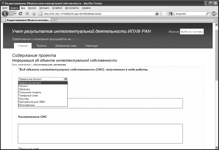- Приложение "Регистрация объекта интеллектуальной собственности", которое предназначено для размещения подразделениями института (научными отделами) сведений об ОИС в базе данных.