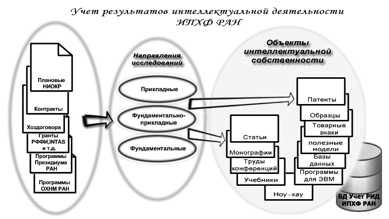 В настоящее время для академических институтов таких типовых решений не предложено. Поэтому одним из важных аспектов решения поставленной задачи является разработка и создание электронных баз данных внутреннего учета и мониторинга результатов интеллектуальной деятельности академического института [4, 5].
