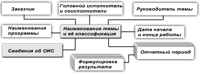 Объект "Наименование темы и ее классификация". Классификация выполняемой работы по теме включает в себя следующие атрибуты: Индекс приоритетного направления РАН на 2008 - 2012 годы, Индекс научного направления РАН, Индекс научного направления института, Номер государственной регистрации, Шифр работы (внутренний номер темы), Вид работы (НИР, ОКР, ТР, НИОКР, ОКТР, НИОКТР).